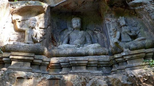 飞来峰面朝灵隐寺的山坡上,在青林洞、玉乳洞、龙泓洞、射阳洞以及沿溪涧的悬崖峭壁上,遍布五代以来佛教石窟造像有多达三百四十余尊。灵隐寺距今已有一千六百余年历史,寺内布局与江南寺院格局大致相仿,全寺建筑中轴线上依次为大雄宝殿、药师殿、法堂、严华殿。
